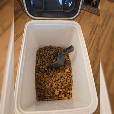 [This review was collected as part of a promotion.] This container works well for storing food! The lid keeps the food fresh and protects it from moisture and from the curious cats. The scooper is also a super helpful addition to this. My only worry is that it feels a little cheap and flimsy so I’m not sure how long it’ll hold up.
