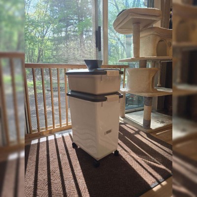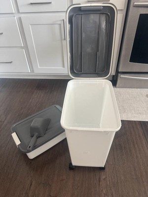 [This review was collected as part of a promotion.] This is such a better solution to storing my dog’s food than folding the bag over and stuffing in the closet. The food stays fresh and Lola is happy. I love that there are wheels so that we can easily move it in and out of the closet and the bonus storage bin sits neatly on top to store the scoop, extra treats, or anything else you choose. This is a great storage solution!
