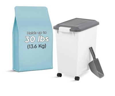 [This review was collected as part of a promotion.] I really like the design of these pet food storage containers. The flip lids open all the way back so you don't have to hold onto it while you're scooping. It's got a great seal on each lid to keep your food and treats fresh. The containers seem quite durable, and so do the wheels. I love the included scoop, too. The big one holds a 30-pound bag of food, and the smaller one holds 11 pounds of treats or whatever you care to store in there.