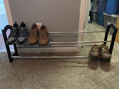 [This review was collected as part of a promotion.] This is a nice little shoe rack. First of all, it is very easy to put together. Everything just snaps into place. It takes no longer than a few minutes to put together. It is extendable, so if you are short on space you can shorten it, which we had to do, or you can make it longer if you have quite the shoe collection. The bars are metal and not plastic, so it should hold up well with time. Overall, it solved the issue of having a ton of shoes just laying around the house and really helped to organize things.