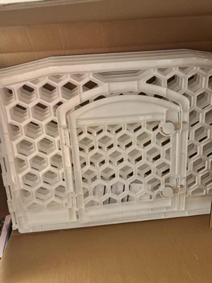 The easy-access IRIS 24'' Exercise 10-panel pet Playpens with door is perfect for puppies, extra small to medium sized dogs and other family pets. Use it as an indoor dog Fence, play gate, dog play yards, or dog exercise Pens. The portable playpen for dog provides plenty of play space for pets. Each panel of the IRIS playpen measures 33.6"W x 24"H, doors are 14.5''W x 16.5''H and the distance between bars is 1.7'. Built-in locks on the pet pen door twist to open for easy pet entry. The durable molded indoor pet pen will last for years. Pet pens can be positioned in different shapes to best suit your space capacity and pet's needs. The plastic panel on the dog playpen with door securely snaps together to keep your pet inside. The panels for dog exercise Pen with door also feature a non-skid rubber foot to protect flooring.
