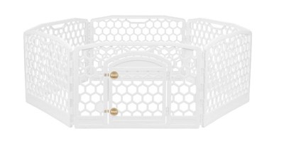 [This review was collected as part of a promotion.] Great pen for small pups. The door so you can just open it and let them out rather than having to lift them over is nice and would be even nicer in the taller versions. It is lightweight enough to move around but sturdy enough that the pups can’t knock it over easily.