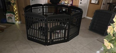The easy-access IRIS 34'' Exercise 8-panel pet Playpens is perfect for medium to large sized dogs and other family pets. Use it as an indoor dog Fence, play gate, dog play yards, or dog exercise Pens. The durable molded indoor pet pen will last for years. Portable playpen can be positioned in different shapes to best suit your space capacity and pet's needs. The plastic panel on the dog playpen securely snaps together to keep your pet inside. The panels for dog exercise Pen also feature a non-skid rubber foot to protect flooring. Made in the USA.