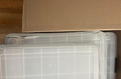 Store your favorite keepsakes and other large valuables in this 74 Quart WeatherPro™ heavy-duty storage tote. The WeatherPro™ seal on the storage bin lid protects contents by keeping air and moisture out. Safely store up to 50 pounds of material, such as crafting supplies, camping gear, board games or blankets in these big storage bins. The grooves in the reinforced lids means these 74 quart stackable totes with lids can be placed on top of the 41, 62, 74, and 103 quart totes to save space, or stack two of the 19-quart boxes securely on top of the 74 quart Iris tote to create a customized storage solution. See other items in this family: 6.5 quart, 19 quart, 30 quart, 41 quart, 46 quart, 62 quart, 74 quart, and 103 quart WeatherPro™ heavy-duty storage totes.