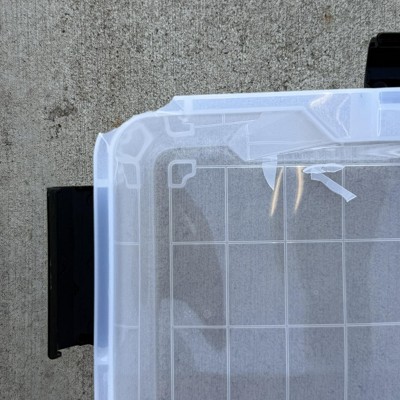 6 durable buckle latches on WeatherPro™ tote lid secure contents inside. Reinforced lid provides stability to stack multiple plastic storage bins.