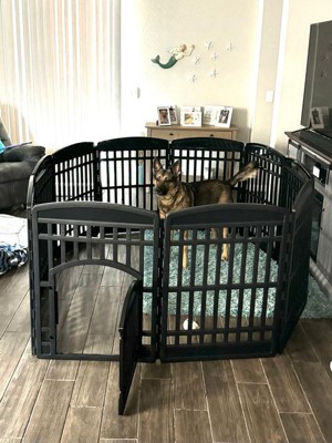The easy-access IRIS 34'' Exercise 8-Panel Pet Playpens are perfect for medium to large sized dogs and other family pets. Use it as an indoor dog fence, play gate, dog play yards, or dog exercise pens. The durable molded indoor pet pen will last for years. Portable playpen can be positioned in different shapes to best suit your space capacity and pet's needs. The plastic panel on the dog playpen securely snaps together to keep your pet inside. The panels for dog exercise pen also feature a non-skid rubber foot to protect flooring.