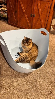 [This review was collected as part of a promotion.] This litter box is Huge! I like the rounded sides, handles, and spout for easy pouring. It seems like a very durable plastic. I am hoping the size helps my cat pee in other spots and actually cover it all up for better odor control and cleaning ease. Would be great for multiple cats.