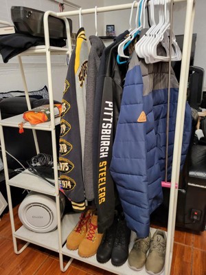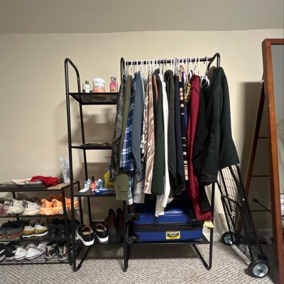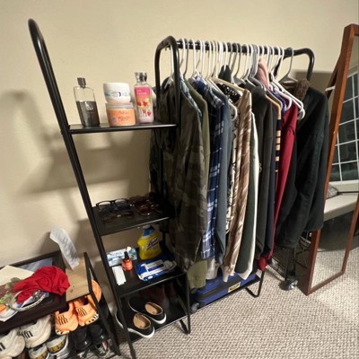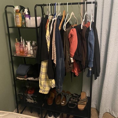 Metal shelves on bottom and side of the clothes rack for storing shoes, accessories, and more