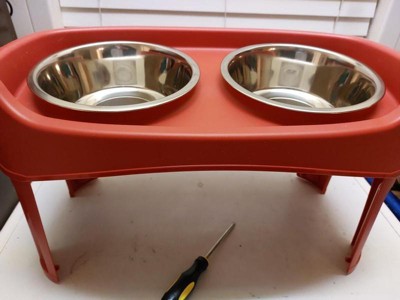 [This review was collected as part of a promotion.] This dog feeder stand is a nice, helpful item. It comes with a set of legs to raise the height even more. Some dogs need tge extra height, so they don't have to bend down so far to eat. The pans are a good size, especially for bigger appetites. They are easily cleaned in the dishwasher. The stand itself can be cleaned off easily, and is a nice bright red color.