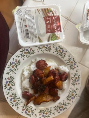 [This review was collected as part of a promotion.] Texture is very sticky my kids didn’t like it but I didn’t mind adding some soy sauce to the sausage and pineapple rice bowls came out great with the rice. Cooks fast but when opened up the rice smelt like chemicals from the seal I’m guessing. I used the hot water method to warm the rice up.
