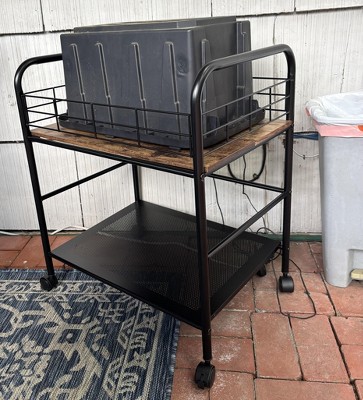 This small cart with wheels, was exactly what I was searching for. It was easy to put together, and replaces an old rusted out TV cart, to hold a radio on our outdoor covered porch. I redecorated our patio and needed something black and modern. The measurements were perfect. Very fast delivery too!