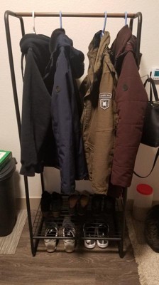 [This review was collected as part of a promotion.] I love this rack. It’s compact but does so much at once as a shoe rack, towel rack, bag holder, and a clothes rack! The rack wasn’t assembled and I was amazed how easy it was to assemble. The parts are of high quality (a little heavy cause of the bars that make up the rack) and really sturdy. They include these felt stickers to put under the bars (that touch the floor) and it’s really thoughtful to avoid scratches on the floor! The only thing that I disliked was that the bar that holds the clothes is like a dark brown and the felt stickers were brown also. I feel that since the rack was marketed as black, I would’ve liked if the stickers and the clothes rack bar was black also. It would’ve been prettier. However, the rack hold everything including my outerwear (jackets, dresses, etc) and my bags (purses, totes, backpacks,etc). LOVE THE RACK!