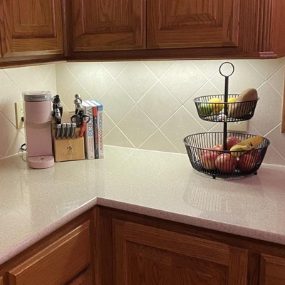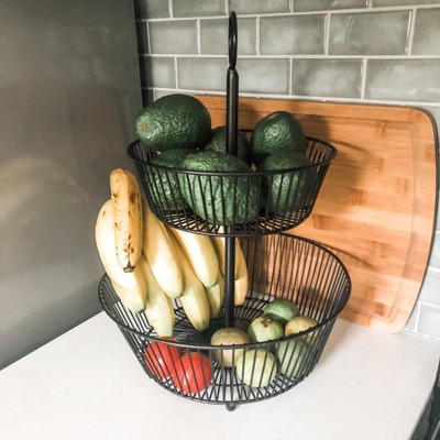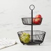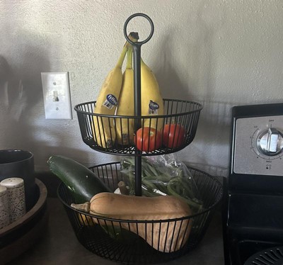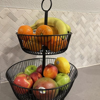 Neatly arrange fruits in this Iron Wire 2-Tier Fruit Basket from Threshold™. Made from metal, this fruit basket features a two-tier design with one small and one large round fruit bowl to let you store an ample amount of fruits or vegetables. Featuring a mesh design, this two-tier fruit basket allows for air to naturally ripen and keep fruits fresh. In a black finish, it features a classic wired design that easily coordinates with a variety of decor styles.