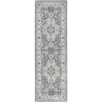 The rug showcases a sophisticated transitional style that artfully bridges the gap between traditional and contemporary decor. Its intricate pattern features an ornate central medallion embraced by lush botanicals and delicate filigree details, all rendered in a tasteful light grey and grey color palette that exudes serenity and versatility.