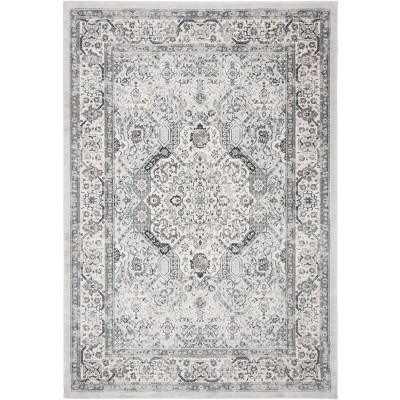 This rug showcases a harmonious blend of grey and cream hues, featuring an intricate pattern that draws inspiration from classic designs while seamlessly integrating with modern aesthetics. At a height of a mere 1/4 inch, the low profile allows for easy placement and minimizes trip hazards, making it a safe and stylish choice for high-traffic areas.
