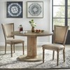 The Isla Dining Table by Lifestorey is a country French farmhouse dream. This table offers an elegant moderately distressed reclaimed natural finish. Crafted of a solid rubberwood base which provides stability and a medium density fiberboard tabletop. The round table is accentuated with a unique grooved pedestal base which provides a rustic appeal.