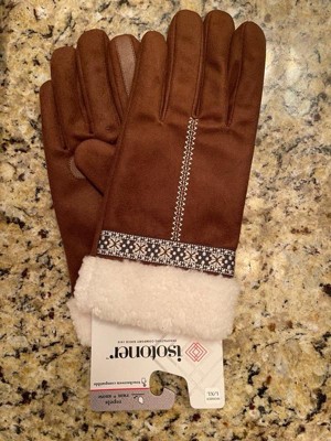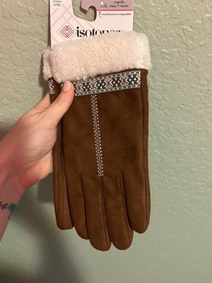 [This review was collected as part of a promotion.] Beautiful winter gloves from Isotoner. Touch screen compatible, repels rain and snow, and made from recycled materials. Soft, warm, and cozy. Lovely ribbon details and faux leather material.