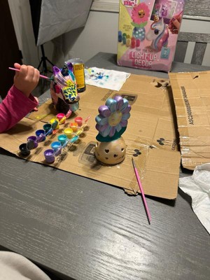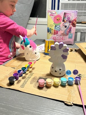 - Set includes: 12 Pearlized Acrylic Paints (Silver, Purple, Pink, Orange, White, 2 Yellow, 2 Green), 1 Ceramic Light-Up Daisy Figurine (3.5 in. x 2.35 in. x 6.1 in.), 1 Ceramic Light-Up Unicorn (5.1 in. x 3.07 in. x 6.06 in.), 2 Paintbrushes, Project Guide