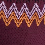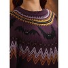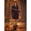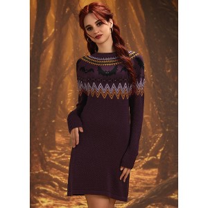 A: The dress showcases an exclusive Fair Isle pattern with flapping black bat motifs and colorful accents.