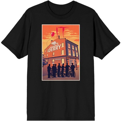 Dive into the eerie ambiance of Derry with this It apparel, showcasing a breathtaking sunset backdrop of Derry and silhouetted children under a menacing building. Suspended above, a lone red balloon and the chilling movie title in red add a haunting touch, inviting fans to revisit the terror of Stephen King's iconic tale. Crafted from premium materials for durability and comfort, this apparel is machine washable for easy care.