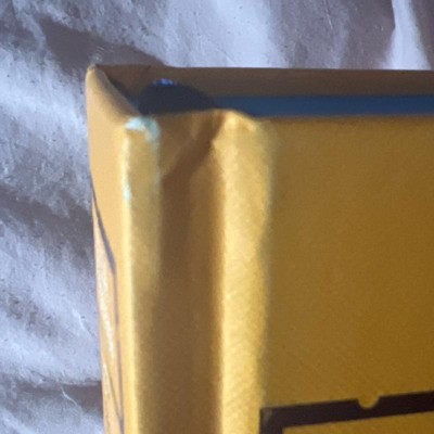 This looks completely different than the picture when I preordered (they have since changed the listing photo). It's gold and purple on the front instead of yellow and blue. It arrived warped with a dented corner.