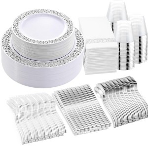 Looking for the perfect dinnerware set for your party? This set comes with 350 pieces, enough for 50 guests. It includes 50 dinner plates, 50 dessert plates, 50 cups, 50 napkins, and 50 silverware sets. The plates are made of food - grade reusable plastic, non - toxic and BPA - free. Simply wash them with water if you want to reuse. The white and silver plates with an irregular edge design bring sophistication to your event. The high - quality cutlery adds convenience to dining. The paper napkins with a silver pattern are not only absorbent but also enhance the overall look of the party. Whether it's a wedding or any other celebration, this set is a great choice to make your event memorable.
