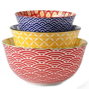 Discover this amazing set of ceramic mixing bowls! It comes with three bowls sized at 3.7/2/1 Quart. The set is extremely versatile, suitable for various tasks like baking, cooking, prepping, and serving salads or snacks. Its nesting design is a space - saver in your kitchen cabinets. The gently flared rims on each bowl make pouring ingredients a breeze, and the anti - slip grip ensures stability. You can use them in the microwave for quick meal prep and reheat food easily. Cleanup is hassle - free as they are dishwasher - safe. With their vibrant colors and geometric patterns, these bowls not only function well but also add a touch of cheer to your dining. Made of lead - free ceramics, they are healthy and durable, perfect for long - term use. Whether you're a home chef or just love cooking, this set is a must - have in your kitchen.