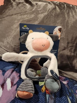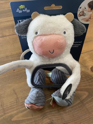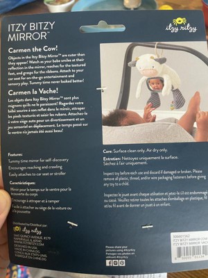 Make way for Carmen the Cow! This Itzy Bitzy mirror is so cute and soft. I absolutely love that you can hang the mirror toy on a carseat or stroller with ease. The 8 sensory features are a definite plus. This toy definitely keeps my 3 month old entertained.