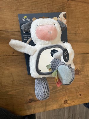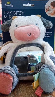 I love this Itsy Ritzy cow mirror toy for my baby! It's the perfect size and my baby enjoys looking at the mirror, crinkle sounds, and tags. The fabric is very soft and durable. We use it for tummy time, in the car seat, and on the play gym. It's great for helping with sensory development and motor skills. While it might be a bit small for some tummy time setups, it's still a fantastic toy overall. Highly recommend!