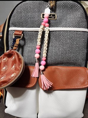 - Removable vegan leather accent tassel with engraved chain link charm