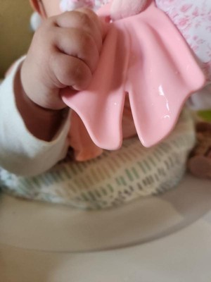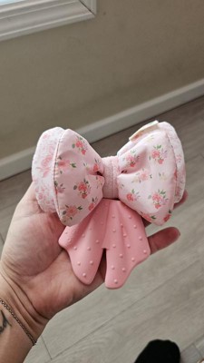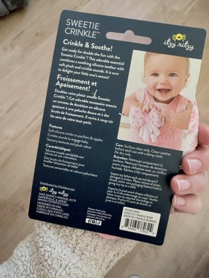 This bow is first and foremost super cute! The pattern is perfect for any girly girl and the pink teether section goes so well with it! I love how it's not a super loud crinkle but enough keep the baby entertained. I throw this in the washer using cold water by lay it out to dry. Popping it in the fridge to aid the pain also helps!