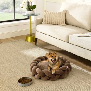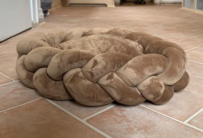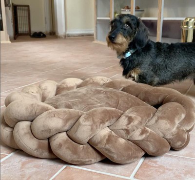 This item arrived quicker than Target estimated. Overall, it's really cute and appears well made. The 20" sized bed seems to work well for my 11lb miniature dachshund as he likes to curl up like a croissant in round beds. The quality feels right for the price. Something of note that I don't see anywhere in the description is that this item is 2 separate pieces. There's no where to secure the 2 pieces together. The braided edge simply sits on the floor enveloping the bottom cushion. It stays together decently well as the braid is pretty weighty and well-made. But if your dog isn't precious with its belongings, the bed easily comes apart. My dog likes to root around before laying down, so while it might work if he's really tired, I'll probably be constantly correcting it after he's been feeling spunky. I think I'm going to tack the bottom cushion to the braided edge with some thread. I dinged this item a whole star because the microfiber fabric pictured doesn't match the actual item at all. It's a more milk chocolate brown than the dark chocolate brown shown.