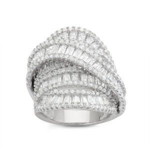 Turn up the sparkle with this show-stopping ring from Ivy Sharpe. Radiating luxury, this statement piece is beautifully crafted with rows of brilliant and baguette-cut cubic zirconia, artistically arranged in sweeping, layered curves that catch the light from every angle. Plated in sleek silver, it delivers high-impact glamour with timeless sophistication.