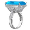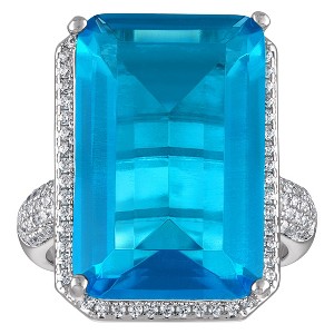 The simulated blue topaz is framed by a delicate halo of sparkling, round-cut cubic zirconia stones set in a polished silver plating. This halo adds a touch of dazzling contrast and further accentuates the vibrant color of the center stone. The shoulders of the ring are also embellished with pavé-set cubic zirconia, adding to the overall glamour and luxurious feel of the piece.