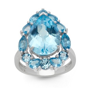 This captivating Ivy Sharpe statement ring features a beautiful cluster of simulated blue topaz stones set in a polished silver plating. The focal point is a large, pear-shaped simulated blue topaz, its elegant cut and serene blue hue immediately drawing the eye.