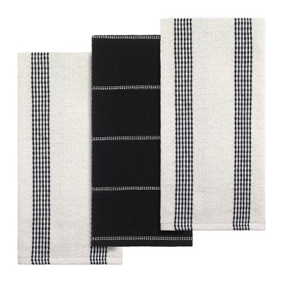 The Izod Essex Black 3-Piece Kitchen Towel Set features 2 designs-an ivory checkerboard design with irregular black stripes and a solid black waffle weave. Made of super soft and absorbent recycled 100% cotton. Towels measure 18" x 28". Set includes 3 towels-2 stripes and 1 waffle weave. Izod delivers the perfect combination of fashion and function for your kitchen.