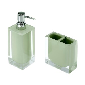 The Izod Marina Green 2-Piece Toothbrush Holder (1) and Soap/ Lotion Dispenser (1) Set features a clear resin exterior that shows off the sage green interior for a sleek, modern look. Adds an updated look to your bathroom, kitchen or home office. Made of durable resin (dispenser pump is plastic) for easy care and long life. Other matching bath accessories and other colors available.
