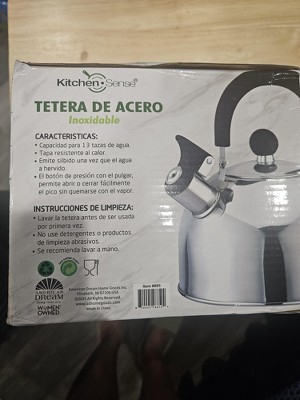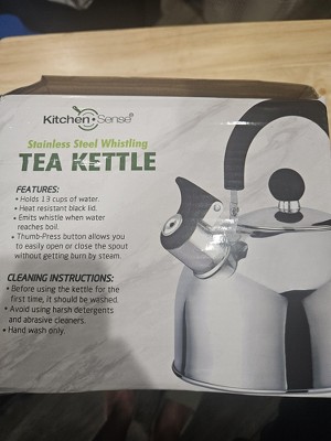The Kitchen Sense 2.5 liter Stainless-Steel Whistling Tea Kettle is constructed with high quality stainless steel. The Kitchen Sense Tea Kettle will whistle when the water is boiling inside. The Handle stays cool of easy pouring. The thick stainless retains heat making your second cup of tea just a good as your first. The Kitchen sense whistling tea kettle is dishwasher safe and easy to clean.