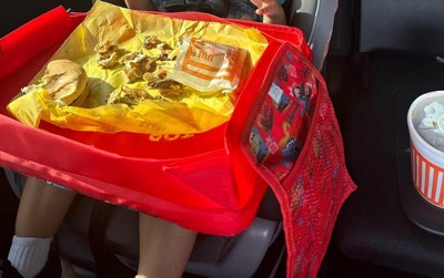 [This review was collected as part of a promotion.] It’s a great portable tray. I really couldn’t get it stay on my headrest to hold my daughters ipad though. It’s also a little flimsy. I do like that you can open it to hold things & the pockets on the side.