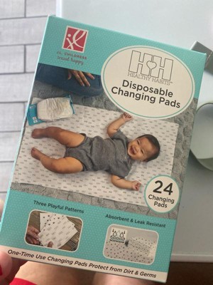 Healthy Habits Disposable Changing Pads provide a clean and comfortable surface for diaper changes wherever you go! Pack includes 24 one-time-use changing pads in three playful patterns. Two absorbent layers of each changing pad provide comfort for baby and a leak-resistant surface. Each changing pad measures 26” x 18” and is perfectly sized for both babies and toddlers. Discard after use – we recommend recycling.