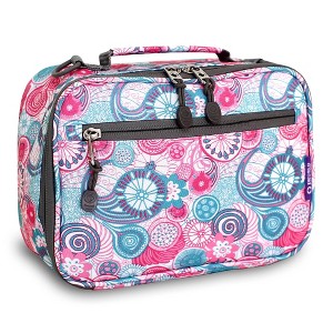 Available in a wide range of colorful patterns and vibrant prints, this lunch bag is perfect for kids that need to carry lunch to school. The J World New York Cody Lunch Bag is made from polyester fabric and features a classic rectangular shape with a colorful allover print, a padded top handle, and an adjustable shoulder strap that offers versatile carrying options. This lunch bag includes a zip around closure and a fully insulated main compartment that offers plenty of storage for a sandwich, snack, and beverage. An exterior zipper pocket provides added storage for utensils, napkins, and other small items.