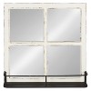 This framed mirror combines rustic farmhouse design with functionality for your home. Hang this mirror in your entryway for one last look out the door and to hold your keys, hooks, mail, or anything you need to remember as you leave the house. You can also hang this mirror in a bathroom or bedroom to create the illusion of space with the four mirrored windowpanes. This framed mirror is constructed of wood with a distressed finish and has a 20 inch wide by 4 inch deep black metal shelf. This mirror arrives completely assembled and ready for use. Two metal d-ring hangers are attached to the back of the frame for easy and secure wall display. The outer dimensions measure approximately 20 inches across and 20 inches high with a depth of 5 inches from the wall. Each mirror pane is 8 inches square. This multi-functional wall hanging wall mirror is the perfect tool to organize to your home, kitchen, or entryway in rustic country design.
