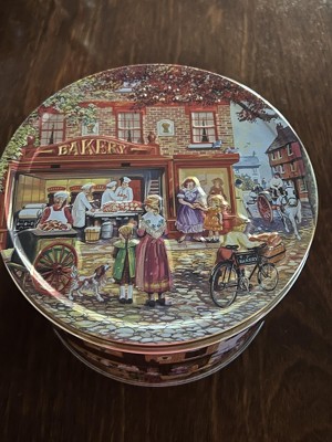 - Comes in an exquisitel embossed metal tin with festive imagery vintage village scene of an old bakery shop in Denmark.