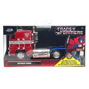 From the classic look of the Transformers cartoon, bring the action home with this collectible 1:32 scale die-cast metal replica of Optimus Prime! Featuring exterior styling directly from the movie, this collectible die-cast metal replica is a must in any Transformers collection! The vehicle features opening doors and robot character art on chassis.