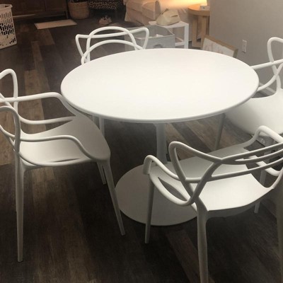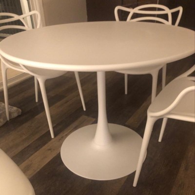 My inspiration were modern chairs. I wanted a pedestal table for easiest use and the cleanest lines. This table fits the aesthetic and is extremely sturdy. It’s mostly metal and all parts are white, even underneath the table top. Very easy to assemble. I can see this lasting a long time. The table top coating seems to be chip resistant almost like it’s part of the metal. I’m happy to have gotten a good quality piece with perfect design for a good price!