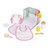 Janod® Toy Nursery & Changing Set | Pretty fabric nappy bag containing everything your child needs to take care of their doll: 1 bib, 1 diaper, 1 spoon, 1 brush, 1 small jar, 1 tube of cream, 1 bottle and 2 cotton pads. The bag boasts multiple inner pockets and unfolds to transform into a terry cloth changing table upon which your child can comfortably lay their doll. Wooden and fabric toy. For ages 2 years and up.