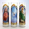 - Authentic religious cathedral candles featuring a copyrighted stained-glass window design