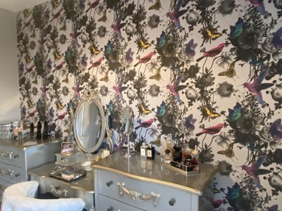 [This review was collected as part of a promotion.] The reason I decided to remodel my small bathroom is the moment I saw this paper and fell in love with it. The background is a bit darker than I would have liked but it doesn’t make me love it any less. It’s a statement maker and I’m happy with the purchase.