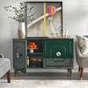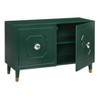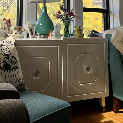 Sophisticated elegance makes a bold statement with the Jaslene Buffet designed by angelo:HOME. This stunning cabinet features unique carved door detail and impressive oversized Lucite doorknobs for a glam look. Squared tapered wood legs accented with brass tone leg brackets complete the design of this high gloss dark hunter green finished cabinet. An added adjustable shelf provides ample space for storing dining pieces of various size or media components as a console in your living area.