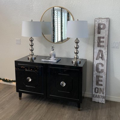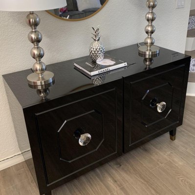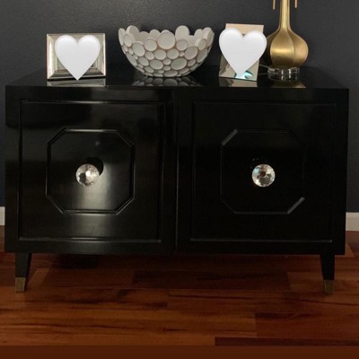 Absolutely gorgeous! Love the big diamond knobs and the gloss finish to it. Very sturdy and well made. A bit shorter than I expected but still stunning. Perfect for tall liquor bottles, as shelves are adjustable. The backboard came damaged (can’t even see it in the pix) but spoke to CS and got a partial refund. Everything else was intact, NO scratches at all.
